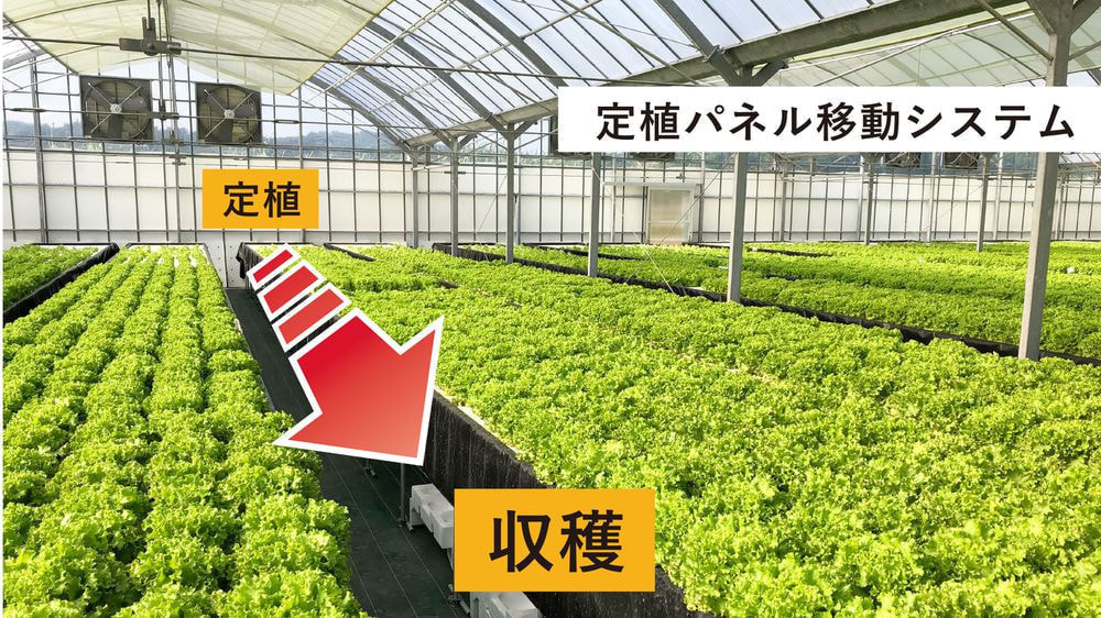 栽培槽内で定植したパネルを一端から入れ、そのパネルを移動しながらもう一端でパネルごと収穫する栽培方法なので収穫スペースは上記の画像のように端だけで通路での作業は保守の時だけです。
