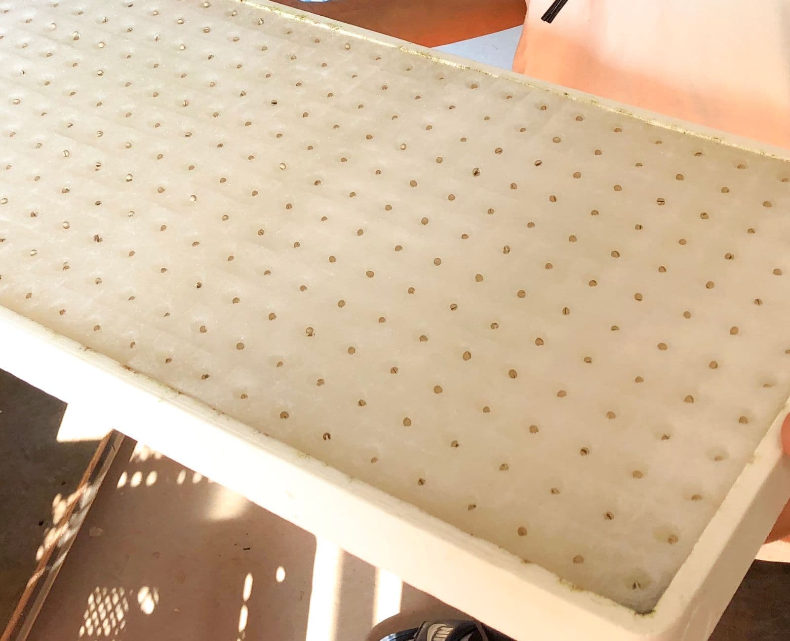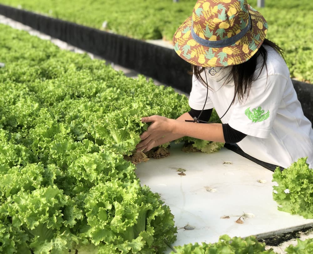 養分を溶かした水溶液を数センチ溜め、水面に栽培パネルを浮かべて培養液を循環させて野菜を育てている。